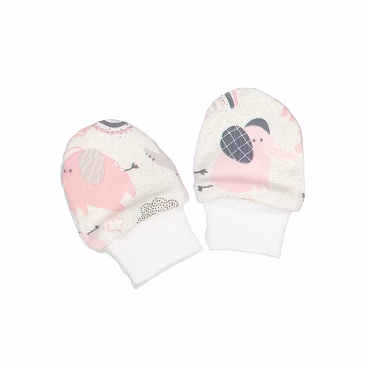 Rosa vantar med elefantmönster från kollektionen Happy Elephants. Vantarna har mudd vid handleden. One-size: 0-3 månader.