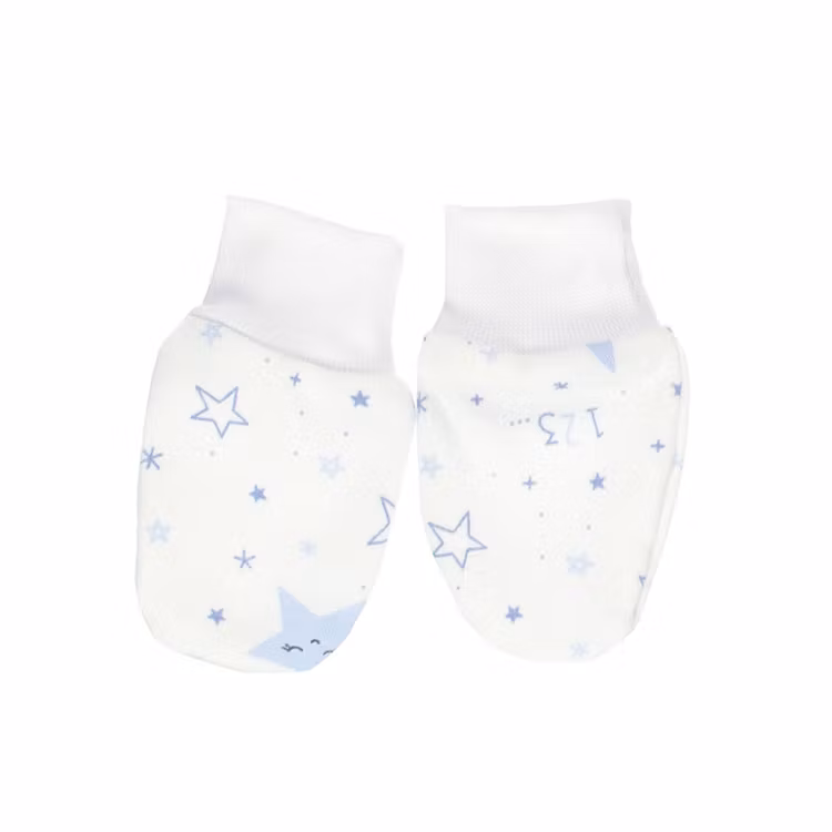 Vita vantar med blå stjärnor från kollektionen Sleeping Stars. Vantarna har mudd vid handleden. One-size: 0-3 månader.