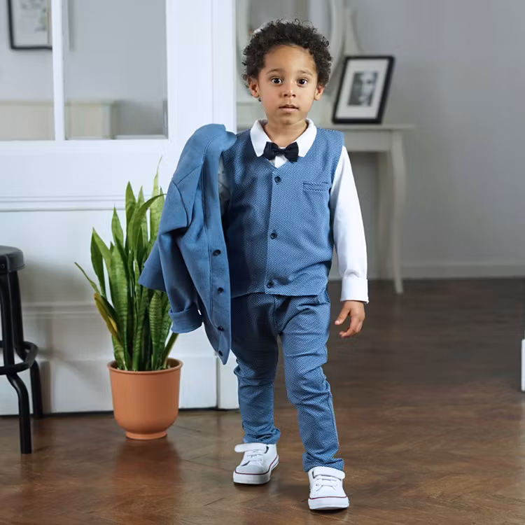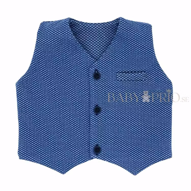 Elegant set i 2 delar som garanterat kommer dra till sig uppmärksamhet på festen. Blå väst och matchande blå byxa. Går att vika upp, se bilder.