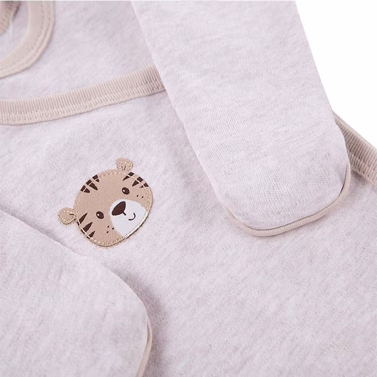 Sött babyset med utvikbara vantar. Beige byxa och omlottbody med söt tiger från kollektionen Baby Love.