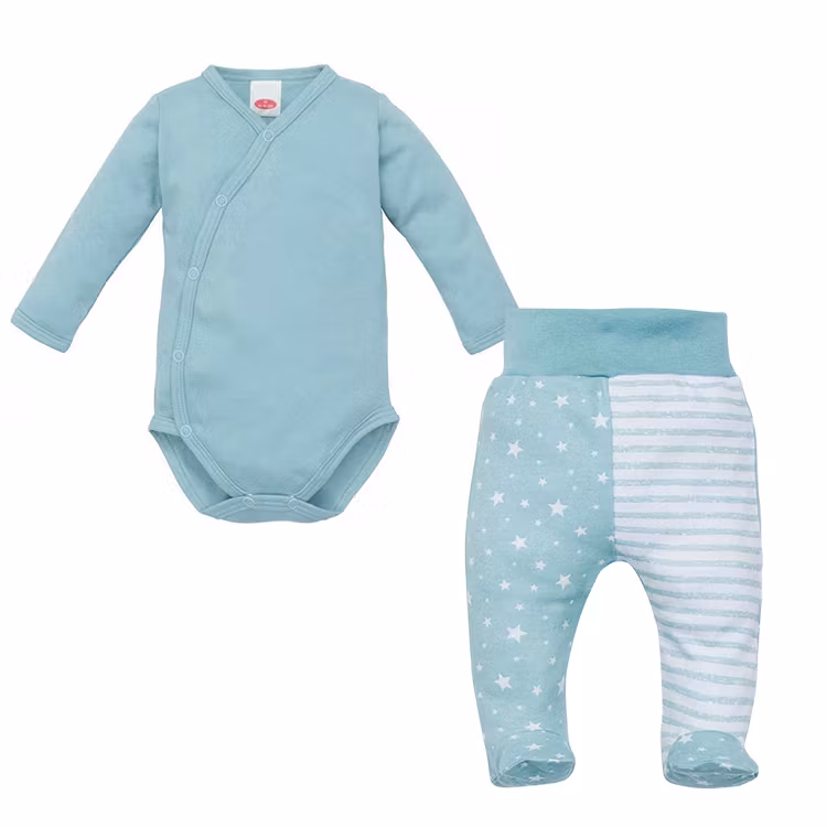 Body med smart knäppning (ej omlott) och matchande byxa med stjärnor och ränder. Byxan har hela fötter.