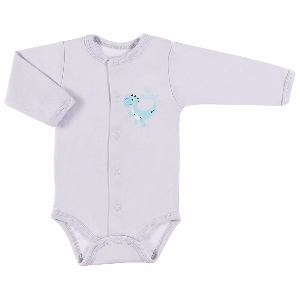 Grå långärmad body med dinomotiv från kollektionen Dino. Bodyn har tryckknappar från kragen till grenen.