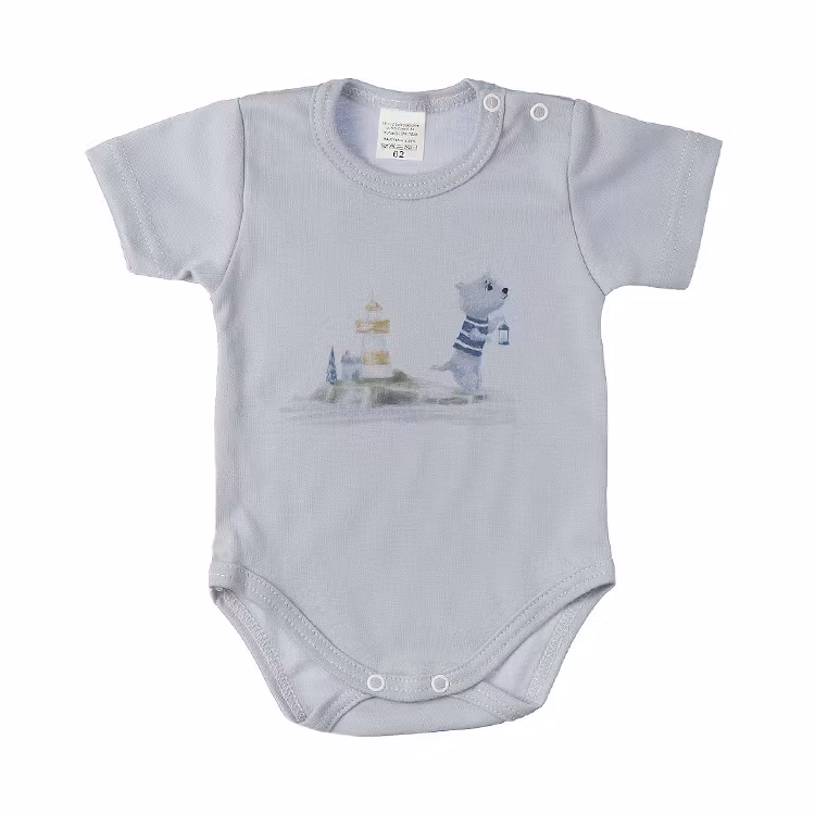 Grå kortärmad body med sött motiv från kollektionen Lighthouse. Bodyn har tryckknappar vid axeln och grenen.