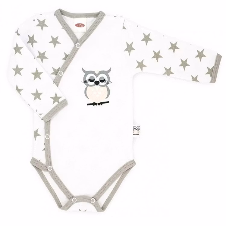 Vit långärmad body med ugglemotiv och stjärnmönster från kollektionen Baby Owl. Bodyn har tryckknappar vid kragen, sidan och grenen.