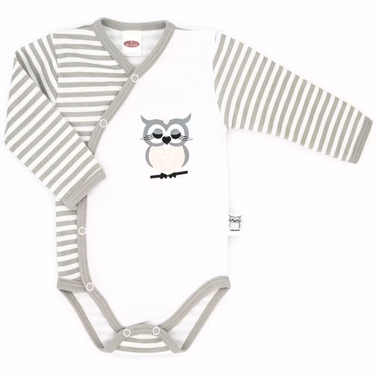 Vit långärmad body med ugglemotiv och randigt mönster från kollektionen Baby Owl. Bodyn har tryckknappar vid kragen, sidan och grenen.