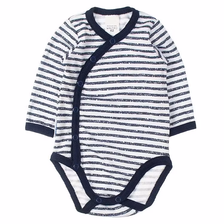 Randig vit-marinblå långärmad body från kollektionen Blue Stripes. Bodyn har tryckknappar från kragen till grenen.