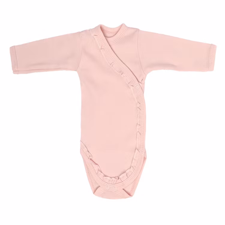 Rosa långärmad omlottbody med volang från kollektionen Blommor. Bodyn har tryckknappar vid sidan och grenen.