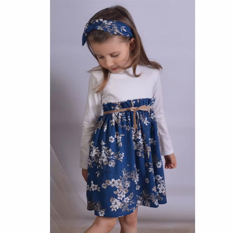 Exklusiv blå-vit klänning från kollektionen Nicole. Klänningen har blommigt mönster och virkade ärmslut. Matchande sött hårband med rosett ingår (se bild).