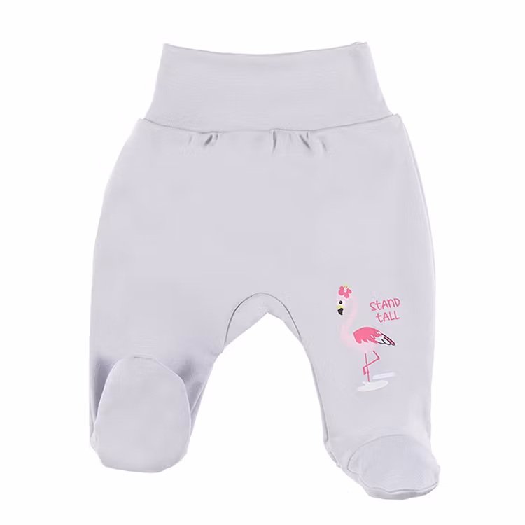 Grå byxa med flamingomotiv från kollektionen Family. Byxan har mjuk mudd i midjan samt hela fötter.