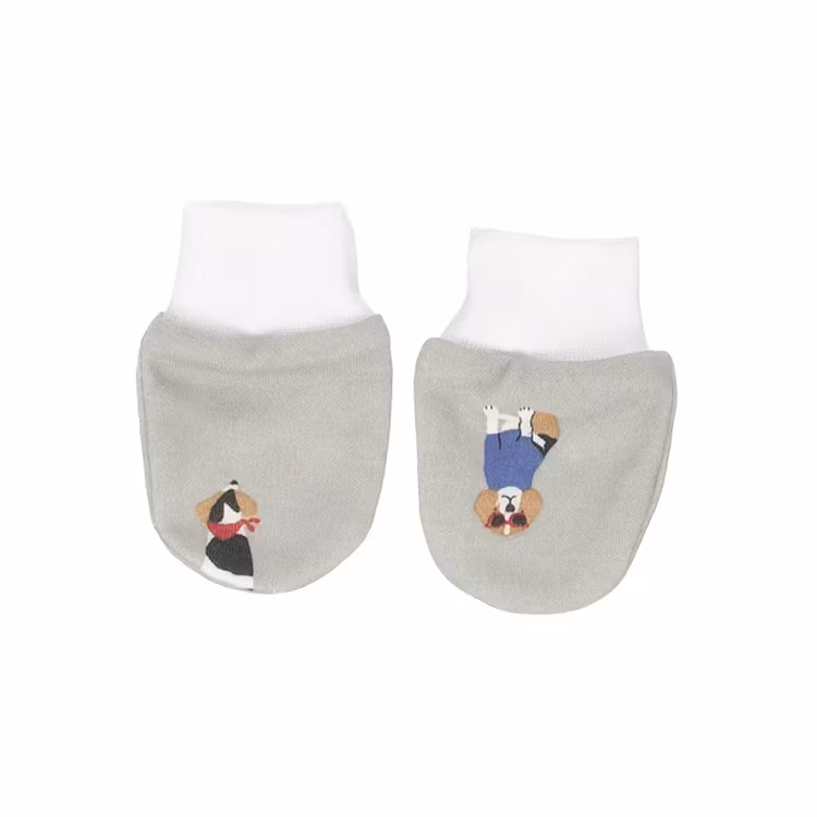 Grå vantar med nallar från kollektionen Classy Dogs. Vantarna har mudd vid handleden. One-size: 0-3 månader.