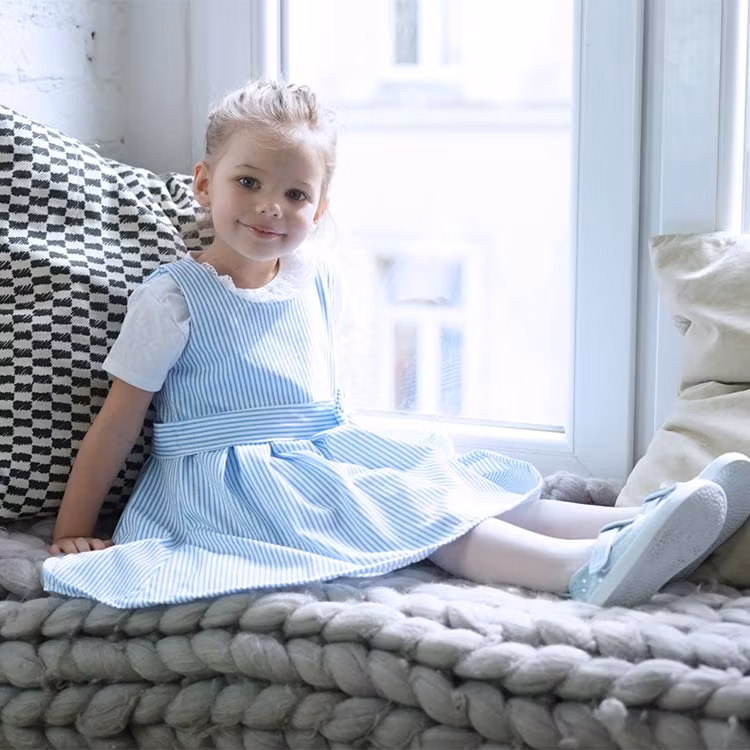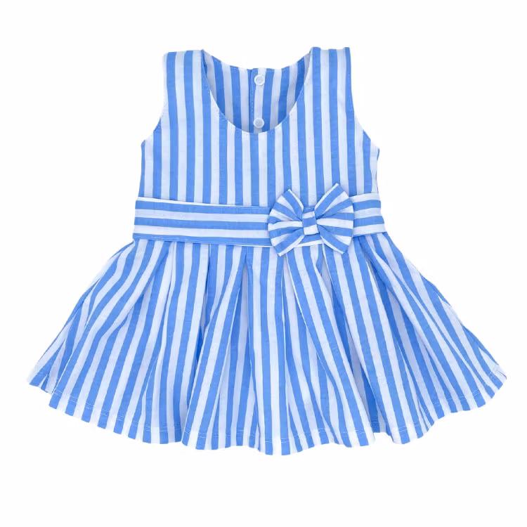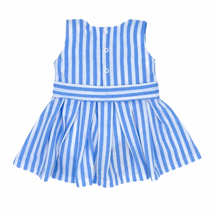 Ljusblå randig klänning från kollektionen Marina. Klänningen har knäppning i ryggen.