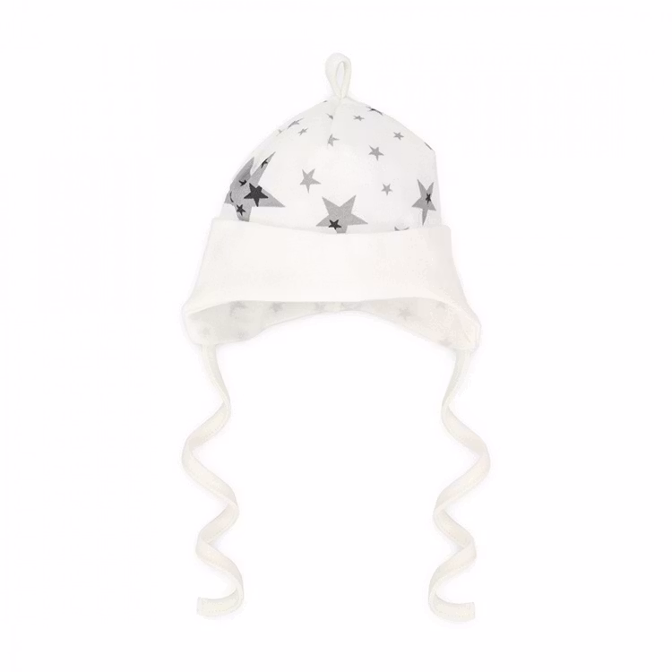 Vit mössa med stjärnor från kollektionen Baby Owl. Mössan har kant och knytband.