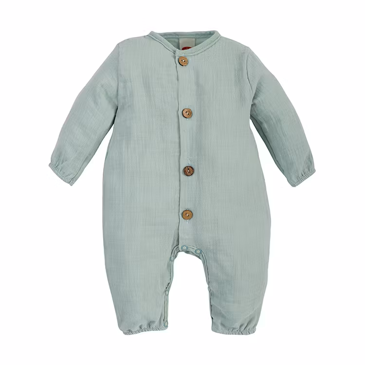 Grön jumpsuit i lyxig bomullsmuslin som är vävd med det finaste garnet, andas väl och har en naturligt fin struktur. Har både knappar och tryckknappar.