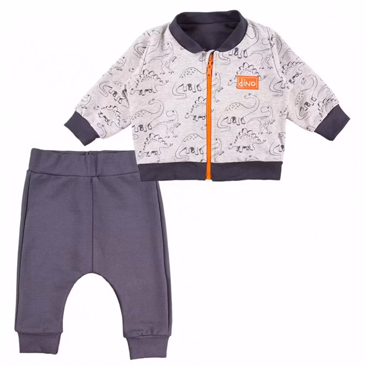 Set i premium bomull med grå tröja och grå byxa från kollektionen Dino. Tröjan har orange dragkedja. Byxorna har resår och mudd.