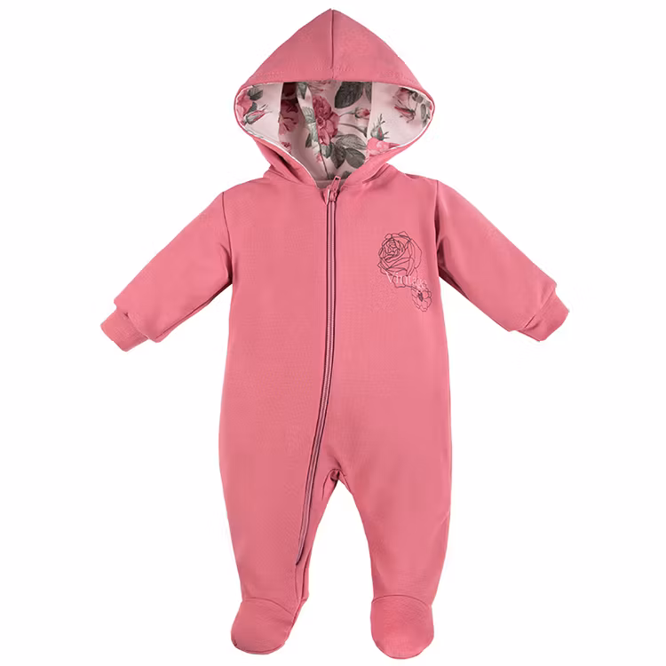 Rosa sparkdräkt från kollektionen Vintage. Sparkdräkten har luva och dragkedja från krage till ben samt hela fötter.