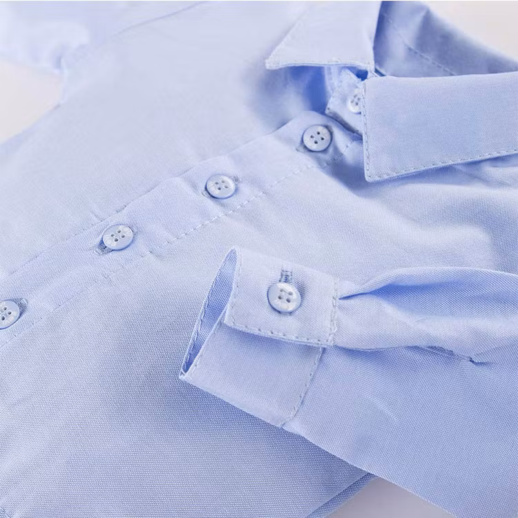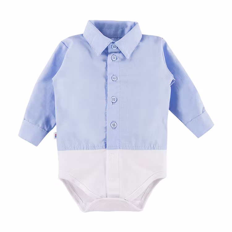 Oxford - ljusblå skjortbody från kollektionen Ceremony. Smart delad, ovandel som en vuxenskjorta och nederdel mjuk som en body. Tryckknappar vid gren och under