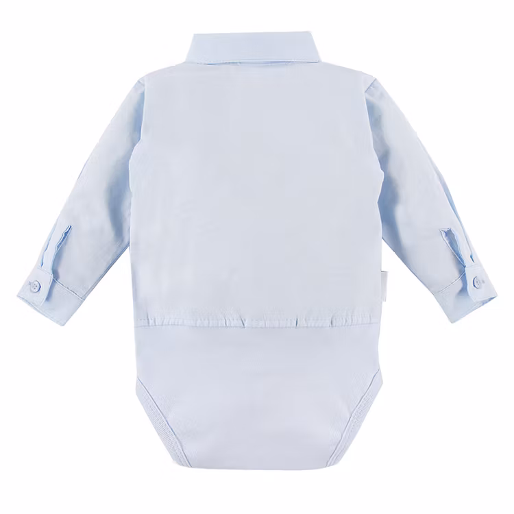 Ljusblå skjortbody från kollektionen Ceremony. Smart delad, ovandel som en vuxenskjorta och nederdel mjuk som en body. Tryckknappar vid gren och under mage.