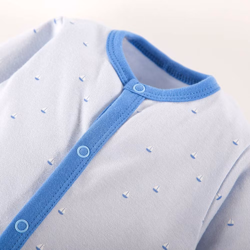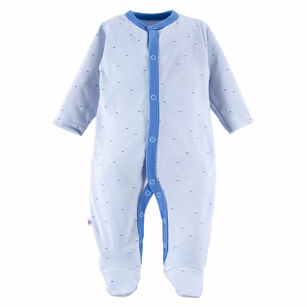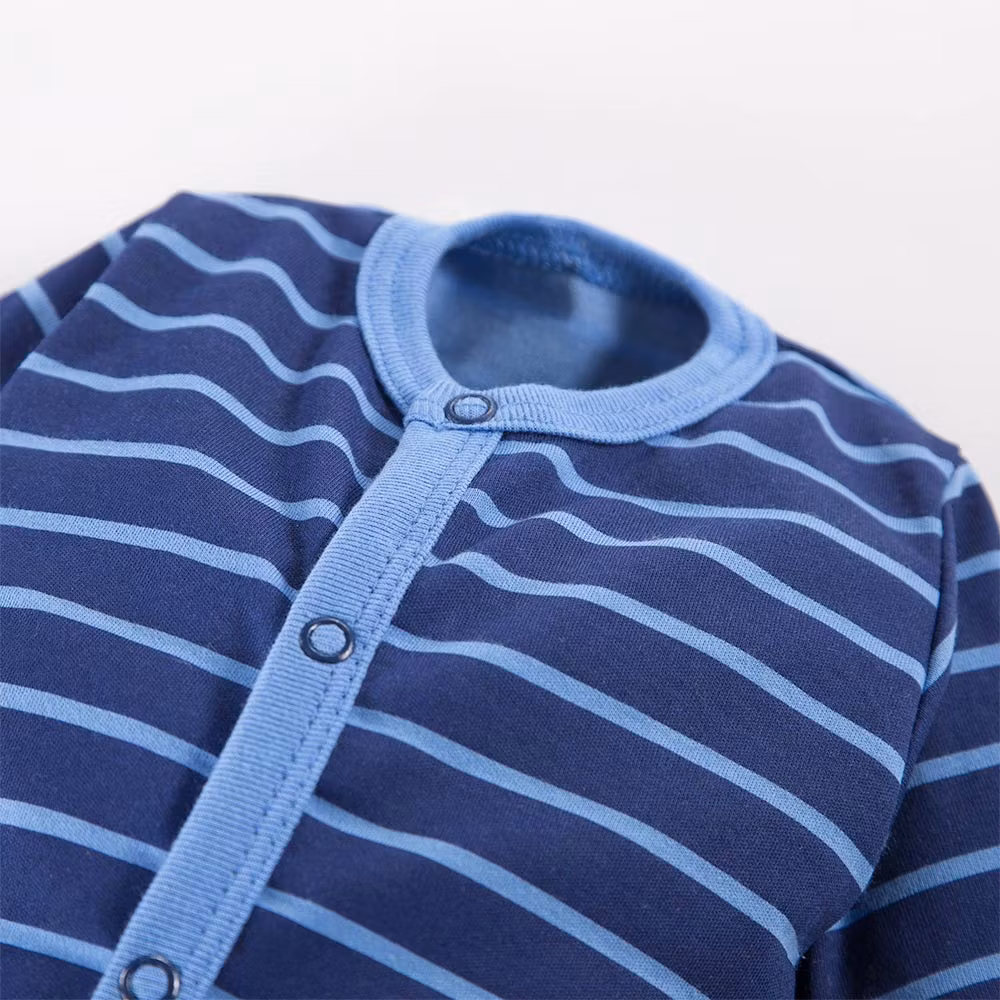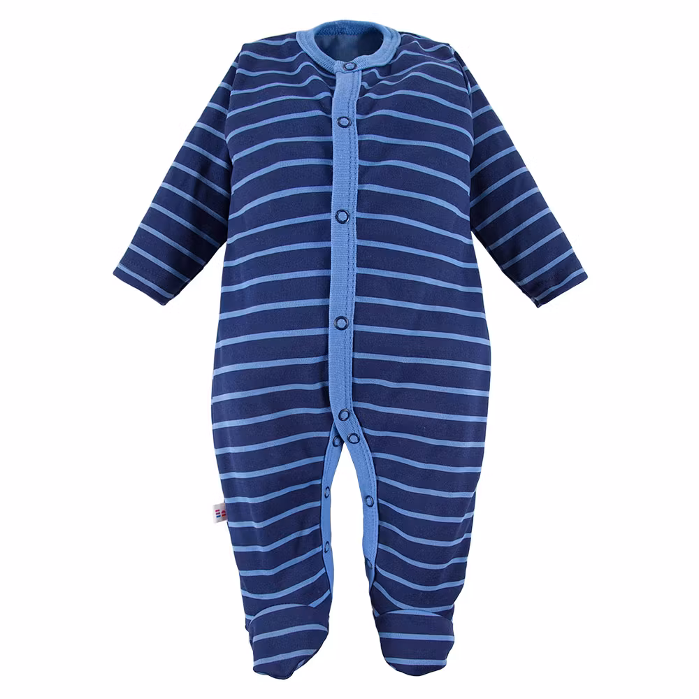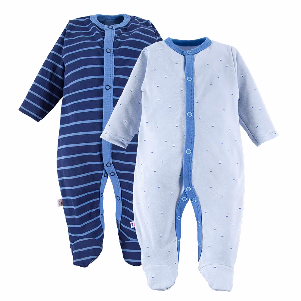 2-pack sparkdräkter ljusblå (båtmönster) och mörkblå (randig). Sparkdräkterna har hela fötter och tryckknappar från krage till ben.
