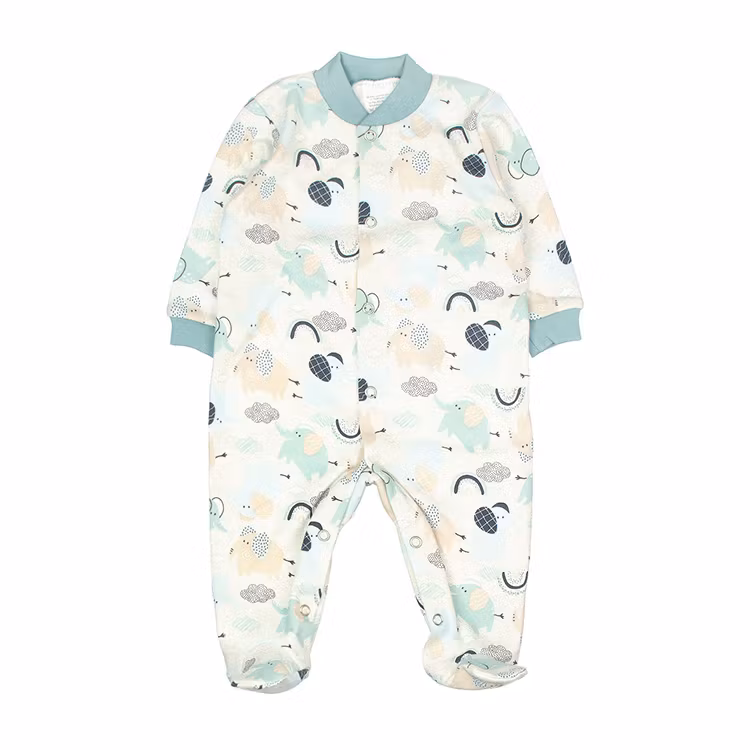 Sparkdräkt med elefanter från kollektionen Happy Elephants. Sparkdräkten har knappar från krage till ben samt hela fötter.