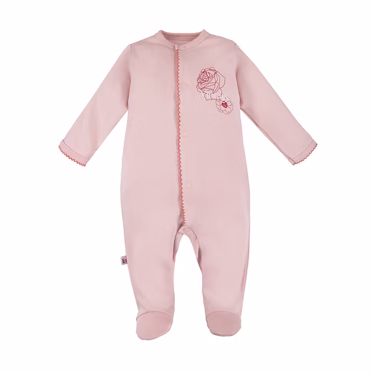 Rosa sparkdräkt i bomull från kollektionen Vintage. Sparkdräkten har knappar från krage till ben samt broderad kant.