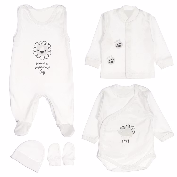 Startpaket i fem delar med söta djurmotiv och text från kollektionen Magical Day. Tröja, body, sparkdräkt, vantar och mössa i bomull.