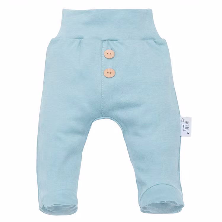 Byxa i turkos färg med farfarsknappar från kollektionen Kameleont. Byxan har mjuk mudd i midjan samt hela fötter.