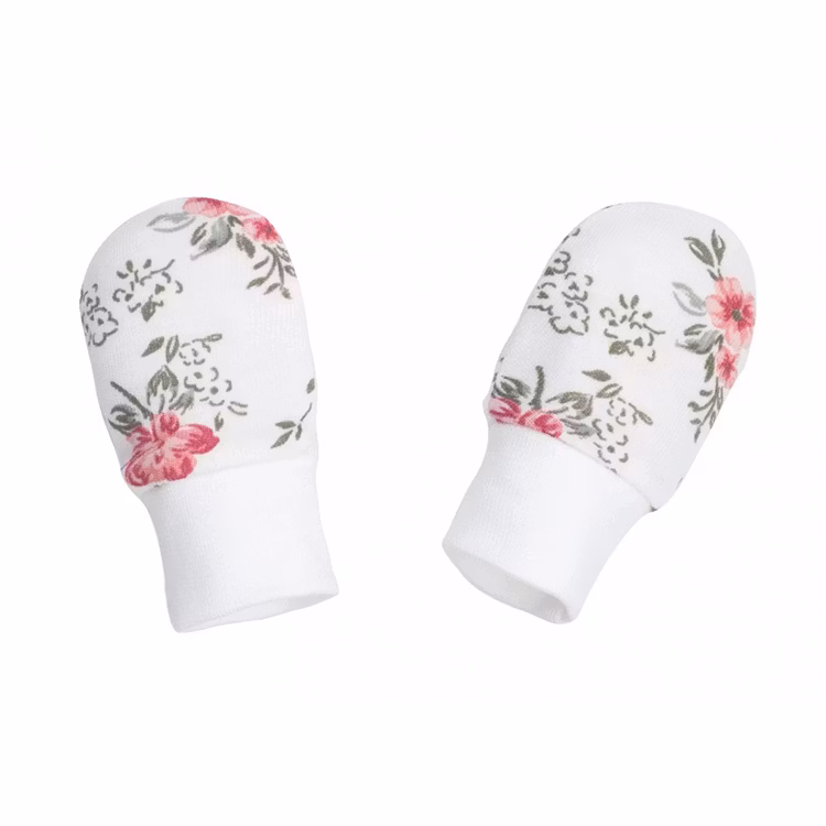 Vita vantar med rosmönster från kollektionen Roses. Vantarna har mudd vid handleden. One-size: 0-3 månader.