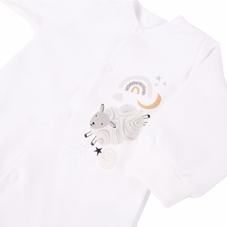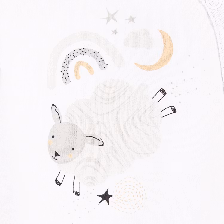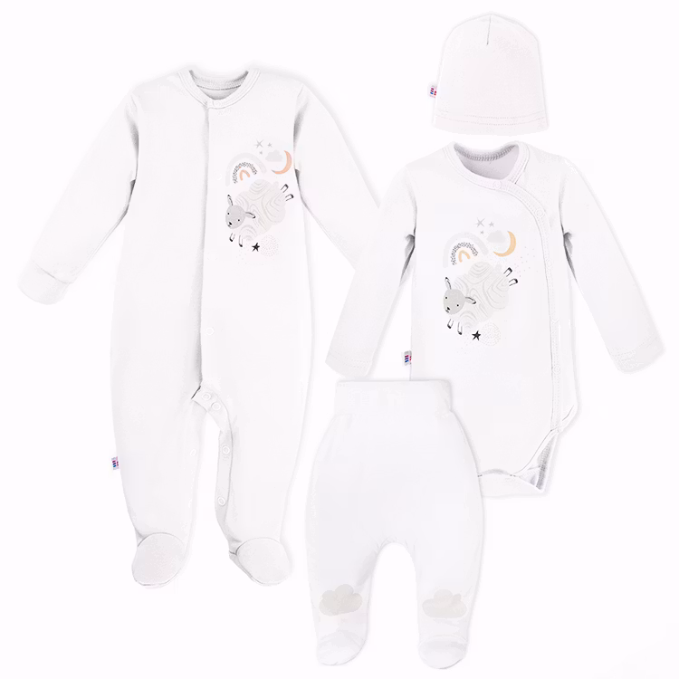 Vitt startpaket för nyfödda från kollektionen Baby Mellow. Långärmad sparkdräkt, body, byxor och mössa.