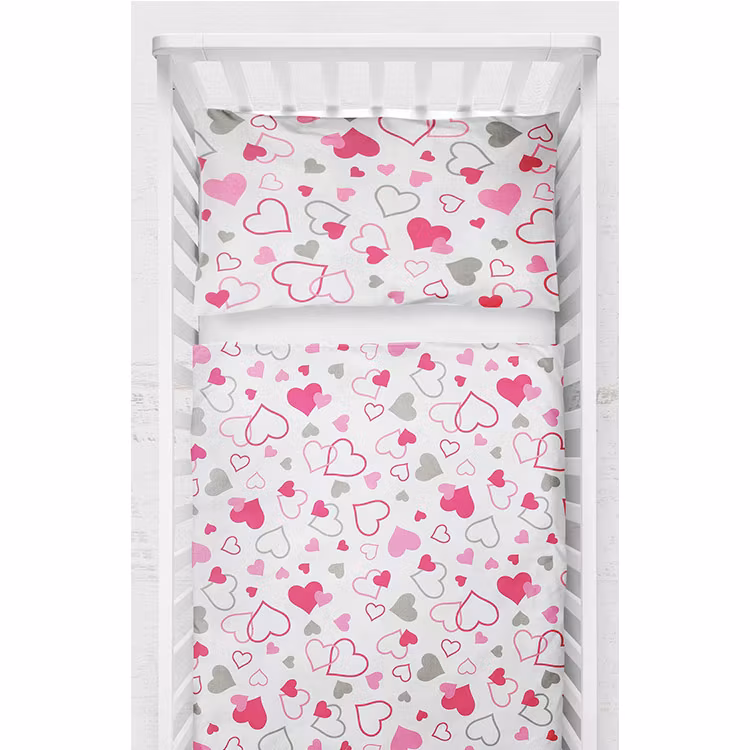 Påslakanset med hjärtan för spjällsäng från kollektionen Hearts. Påslakan med 1st örngott. Samtliga delar har smarta och skyddade dragkedjor.