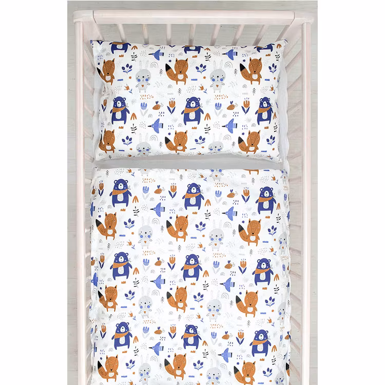 Påslakanset för spjällsäng från kollektionen Woody. Påslakan med 2st örngott. Samtliga delar har smarta och skyddade dragkedjor.