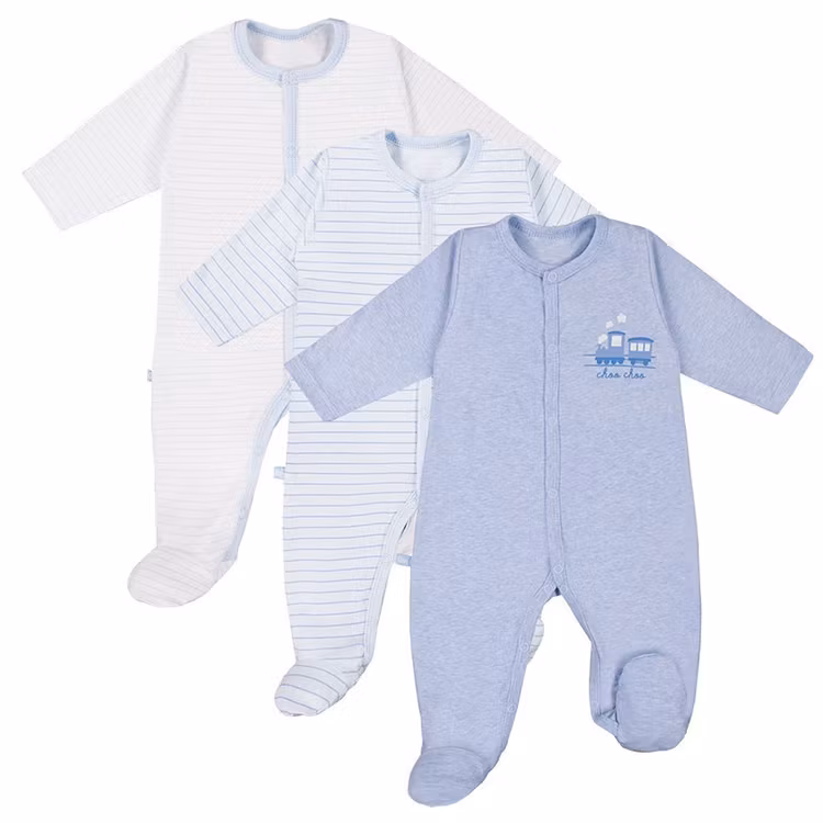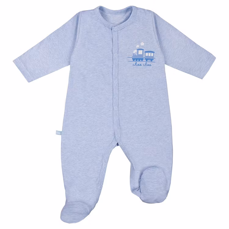 Långärmade sparkdräkter med tågmotiv och ränder från kollektionen Tiny Blue. Sparkdräkterna har hela fötter och tryckknappar från kragen till benen.
