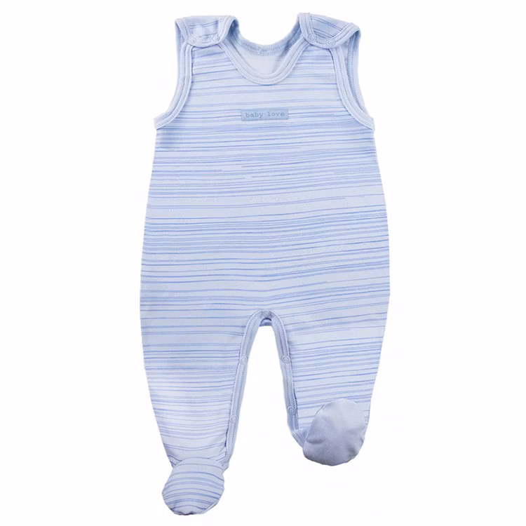 Randig blå premium sparkdräkt utan ärmar från kollektionen Blue Sky. Sparkdräkten har hela fötter och tryckknappar vid axlar, gren och ben.