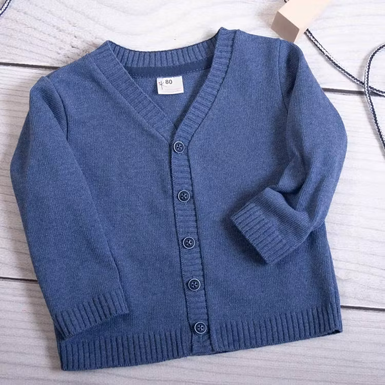 Blå kofta från kollektionen Baby Elegance. Koftan har ribbade ärmslut och kanter samt knappar från krage till midja.