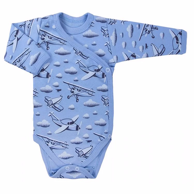 Blå långärmad omlottbody med flygplansmönster från kollektionen Blue Sky. Bodyn har tryckknappar vid sidan och grenen.