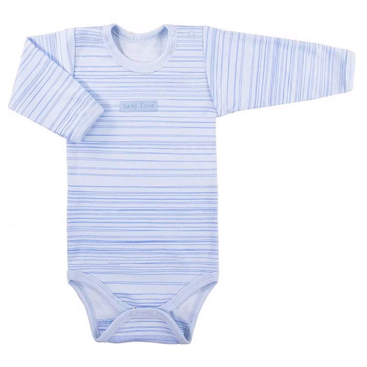 Blå randig långärmad premium body med texten baby love från kollektionen Blue Sky. Bodyn har tryckknappar vid axeln och grenen.