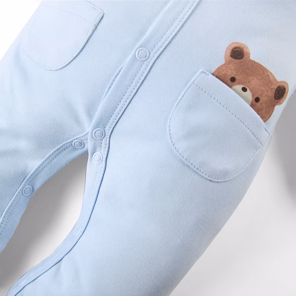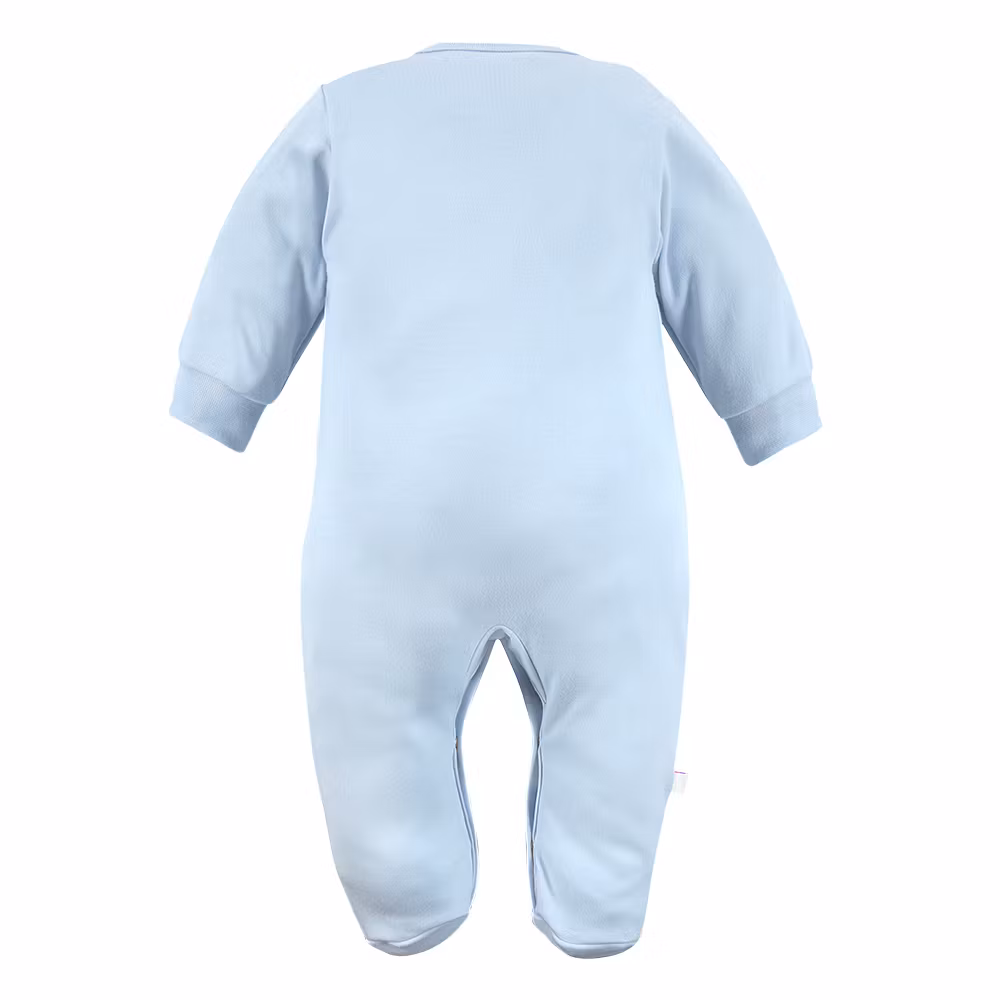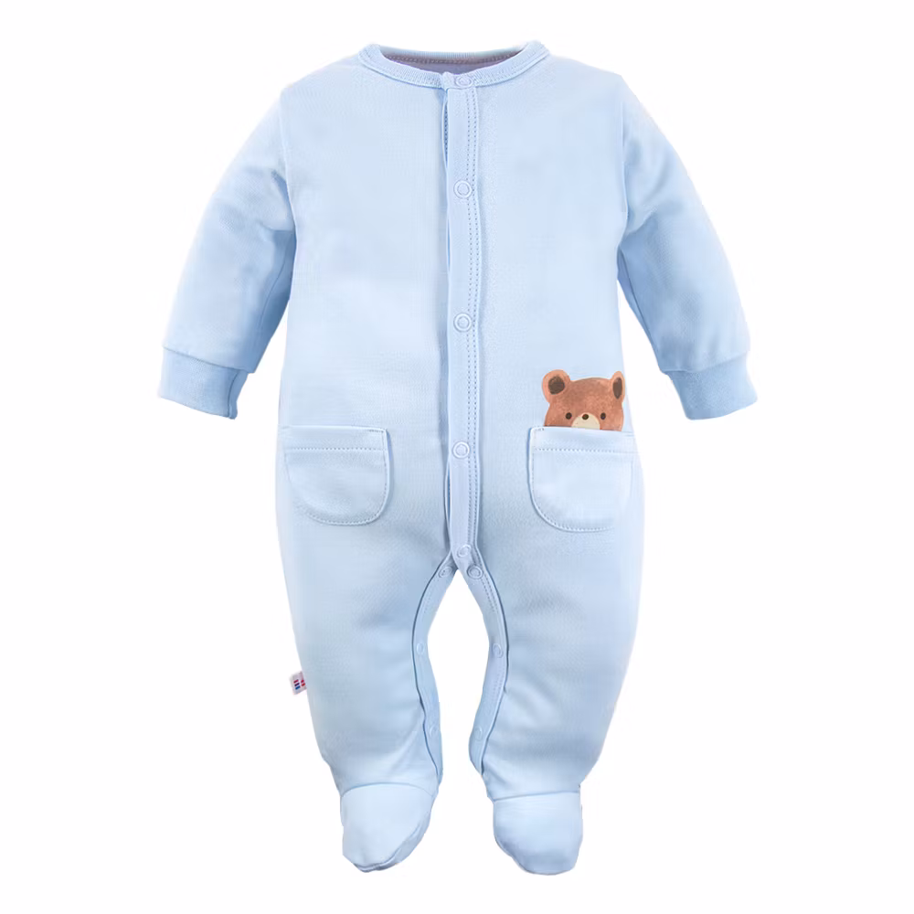 Blå sparkdräkt med fickor och nallemotiv. Sparkdräkten har knappar från krage till ben samt hela fötter.
