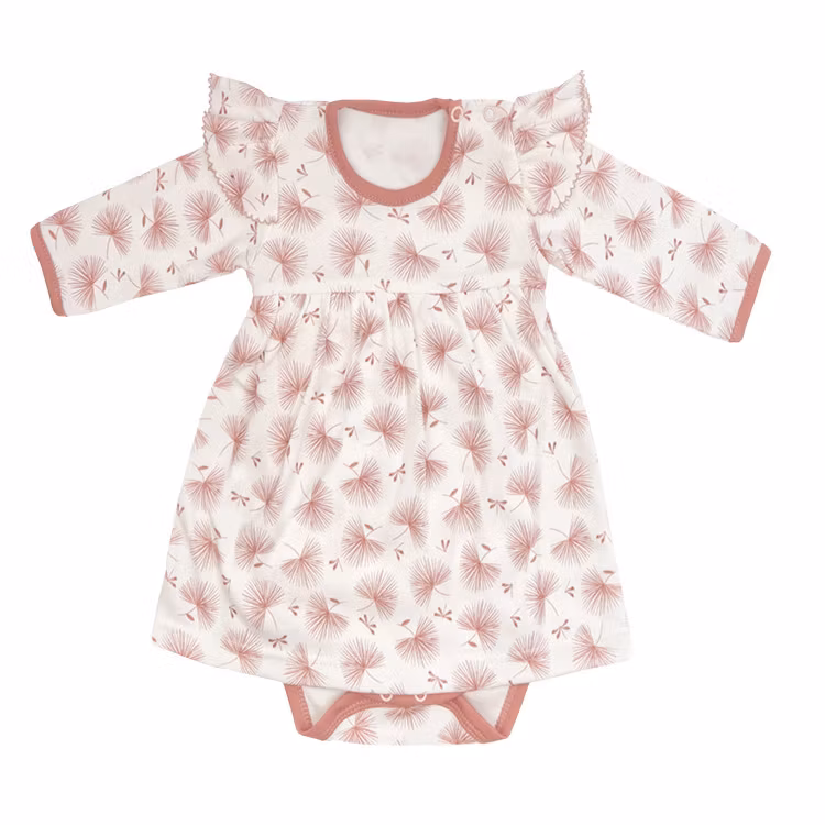 Långärmad bodyklänning med maskrosor från kollektionen Dandelion. Bodyn har tryckknappar vid axeln och grenen.