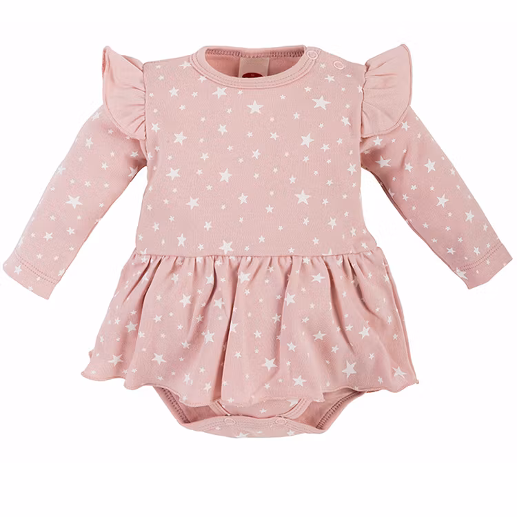 Söt rosa bodyklänning med stjärnor och volanger från kollektionen Baby Stars. Bodyn har tryckknappar vid axeln och grenen.