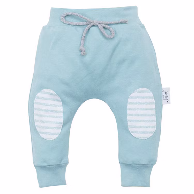 Byxa i turkos färg med randiga knälappar och falsk dragsko i midjan från kollektionen Sweet Dreams. Byxan har mjuk mudd i midja och benslut.