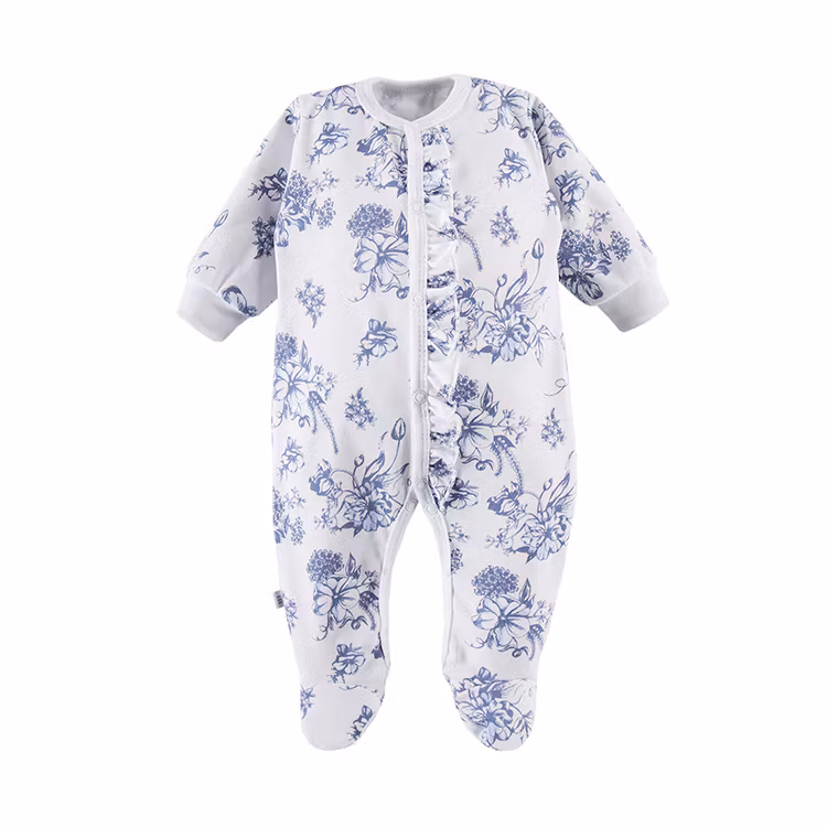 Vit sparkdräkt med volang från kollektionen Botanic. Sparkdräkten har knappar från krage till ben samt hela fötter.