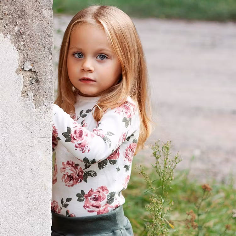 Vit långärmad body med mönster av rosor och rosett från kollektionen Roses. Bodyn har tryckknappar vid axeln och grenen.