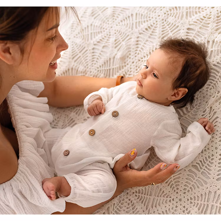 Vit jumpsuit i lyxig bomullsmuslin som är vävd med det finaste garnet, andas väl och har en naturligt fin struktur. Har både knappar och tryckknappar.
