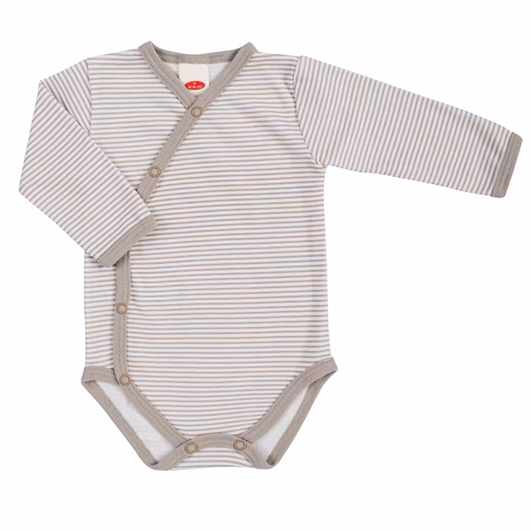 Beige randig body från kollektionen Baby Stripes. Bodyn har tryckknappar från krage till gren. Smart knäppning för snabba byten (ej omlott).