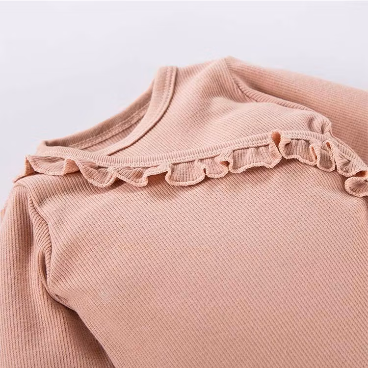Ribbad beige-rosa långärmad body (omlott) med volang från kollektionen Bloom. Bodyn har tryckknappar från krage till gren.