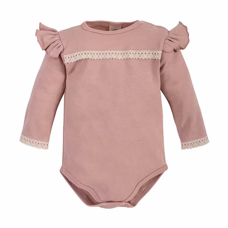 Söt rosa body med spetsdekoration och volanger. Bodyn har tryckknappar vid axel och gren.