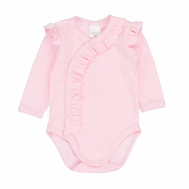 Söt rosa body med volang. Bodyn har smart knäppning (ej omlott), tryckknappar från krage till gren.