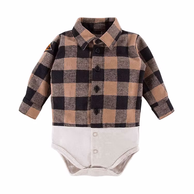 Rutig flanell skjortbody från kollektionen Jump. Smart delad, ovandel som en vuxen flanellskjorta och nederdel mjuk som en body. Tryckknappar under mage.