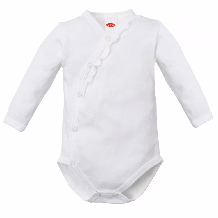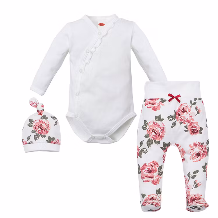 Set i 3 delar från kollektionen Roses. Vit body med volang samt matchande mössa och byxor med hela fötter. Bodyn har tryckknappar från krage till gren.