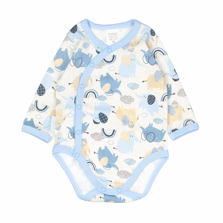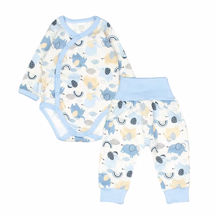 Blå set från kollektionen Happy Elephants. Bodyn har tryckknappar från krage till gren. Byxorna har mudd.