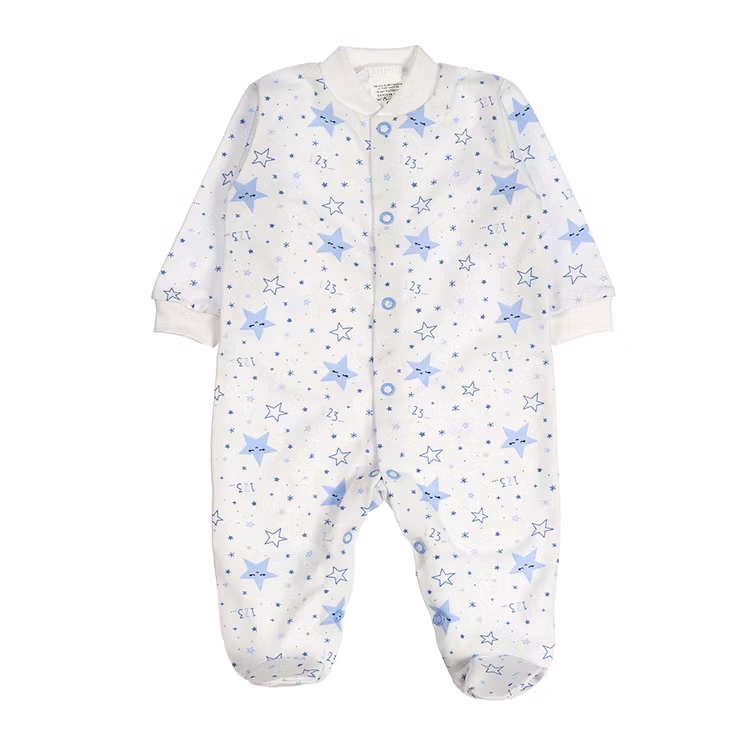 Vit sparkdräkt med blå stjärnor från kollektionen Sleeping Stars. Sparkdräkten har knappar från krage till ben samt hela fötter.